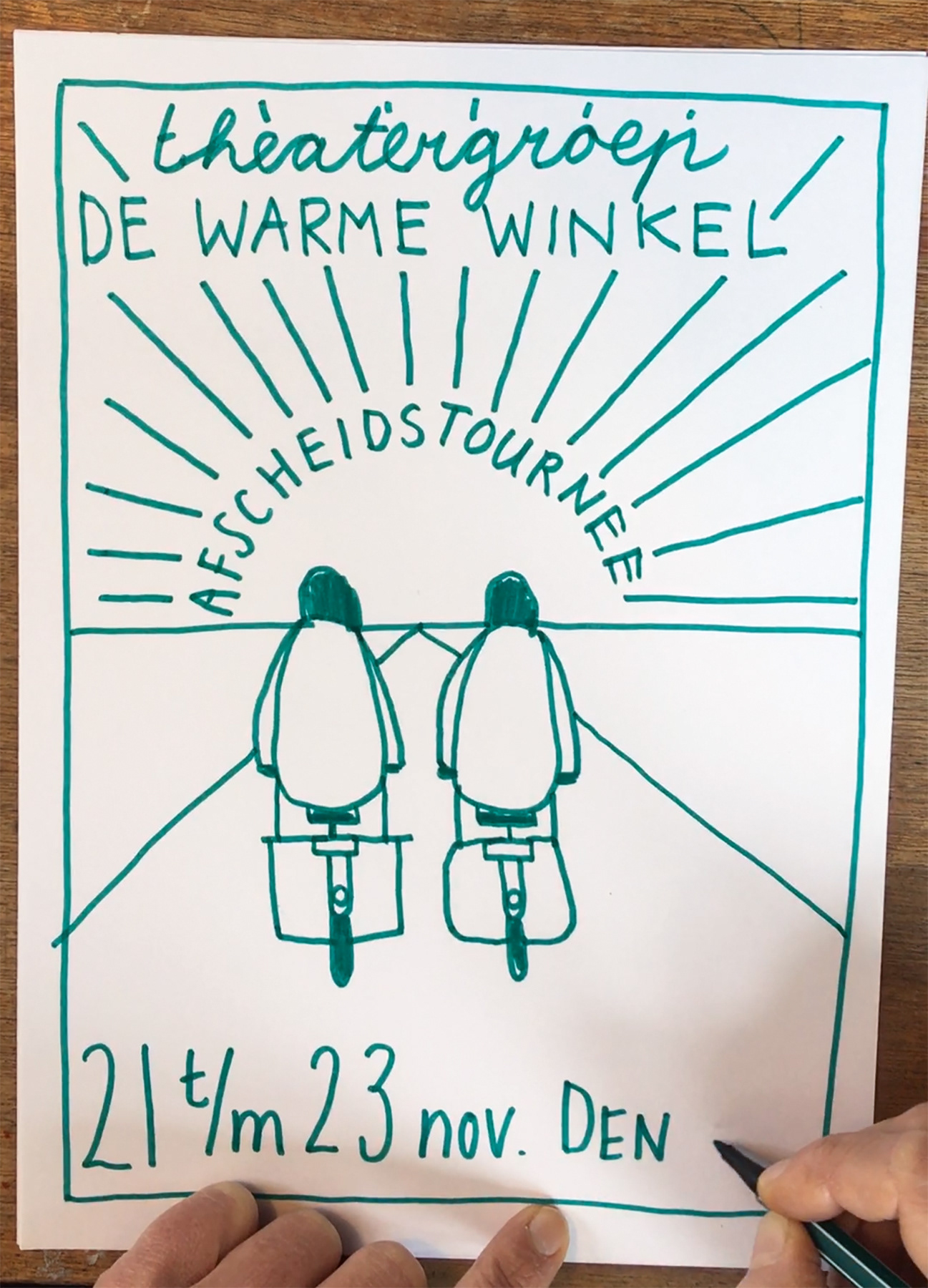 Theatergroep de Warme Winkel gaat in 2020 met de CO2 neutrale voorstelling Afscheidstournee op tournee. Ze vroegen mij om een poster te ontwerpen die, door de pr-medewerkers van theaters, zelf getekend kan worden. Vincent Rietveld legt uit hoe het moet.